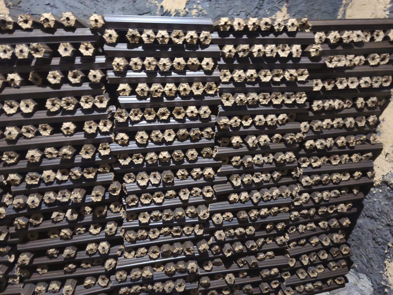 Mùn cưa được tuyển chọn chi tiết theo quy trình trước khi vào dây chuyền ép củi tự động và ép thành các thanh củi hình lục giác hoặc hình vuông dài 450 mm có lỗ ở tâm kích thước 10 mm.